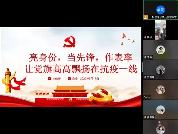 为贯彻落实上级和校党委关于疫情防控的工作部署和要求,进一步发挥广大共产党员在关键时刻的先锋模范作用,筑牢疫情防控安全防线,3月17日晚,音乐学院学生党支部召开疫情防控工作主题组织生活会。学院党委书记李建新参加组织生活会并为学生党员讲授党课。学生党支部书记迟晓波主持会议,音乐学院学生党支部党员60余人通过线上线下相结合的方式参加组织生活会。