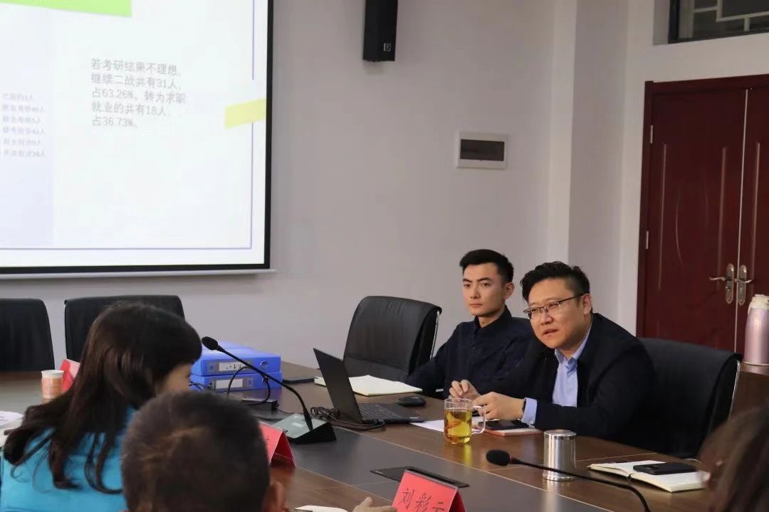 院党委书记姜世安说,学院一直高度重视毕业生就业工作和高质量人才的培养,我院多措并举,打造就业工作全员化、网络化、多元化、精准化。院长王静怡着重介绍了学院“辅导员、班主任、专业教师、大课教师“四级帮扶机制”,引领全院教师牢固树立育人和就业考研指导的全员参与的理念。院党委副书记司现鹏就学生安全稳定工作、毕业生就业和考研工作进行了汇报。