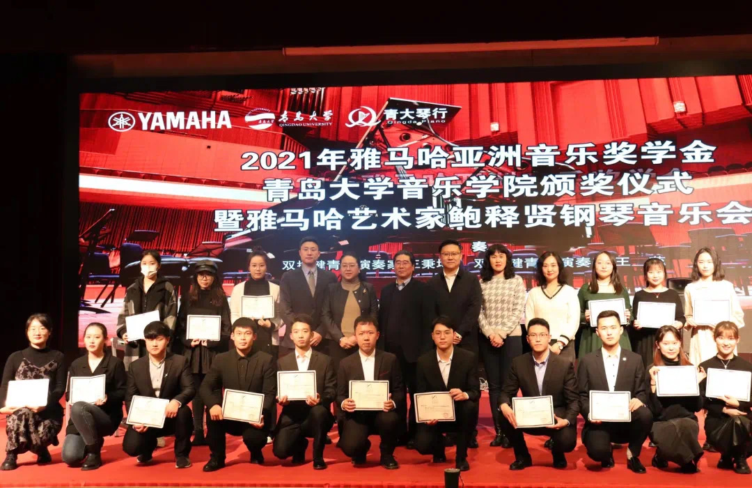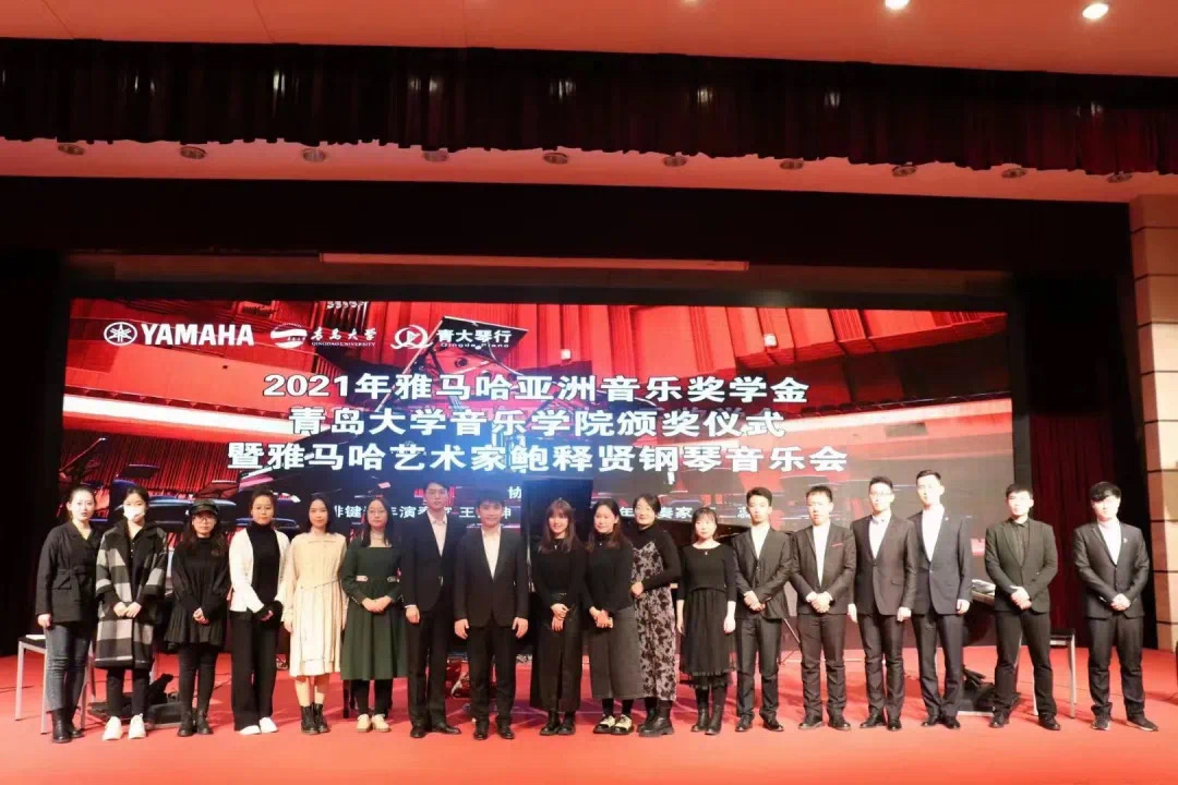 音乐学院向提供奖学金的雅马哈公司和推动本奖学金顺利实施的青大琴行表示衷心的感谢,并对获得奖学金的同学表示热烈的祝贺。对著名的钢琴演奏家鲍释贤先生以及双排键青年演奏家王秉坤和王蕊为典礼演奏表示感谢。王院长在致辞中强调:音乐教育不仅是我们音乐学院的任务,也将是你们未来重要的社会责任。随着国家日益强盛,音乐专业人才将有更广阔的舞台施展才华,音乐器材的生产企业也将会有更加美好的前景。希望通过本次雅马哈奖学金的颁发活动,能够进一步助推音乐学院优良教风学风的建设。更希望本次获奖的同学能够再接再厉,充分发挥表率作用,在学习上取得更新更好的成绩,也希望其他同学积极参与,营造生动活泼、比学赶超的浓郁氛围,建设更加优良的教风、学风,不断取得新的更大成绩,为建设高水平大学做出应有的贡献。