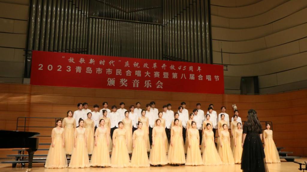 日前,由青岛市委宣传部、青岛市委市直机关工委、青岛市教育局、青岛市总工会、青岛市文联、青岛日报社、青岛市广播电视台主办,各区市委宣传部、青岛市音乐家协会、青岛市合唱联盟、青岛市工人文化宫承办,观海新闻、青岛市广播电视台文创中心协办的“放歌新时代”庆祝改革开放45周年2023青岛市市民合唱大赛暨第八届合唱节顺利闭幕,比赛共吸引来自青岛市各个组别150余支参赛队伍,规模创历届参赛之最。我院合唱团在王邑老师和殷翔老师的指导下,完美演唱了《灯之河》《在灿烂的阳光下》两首合唱作品,最终在比赛中脱颖而出,荣获高校组第一名。