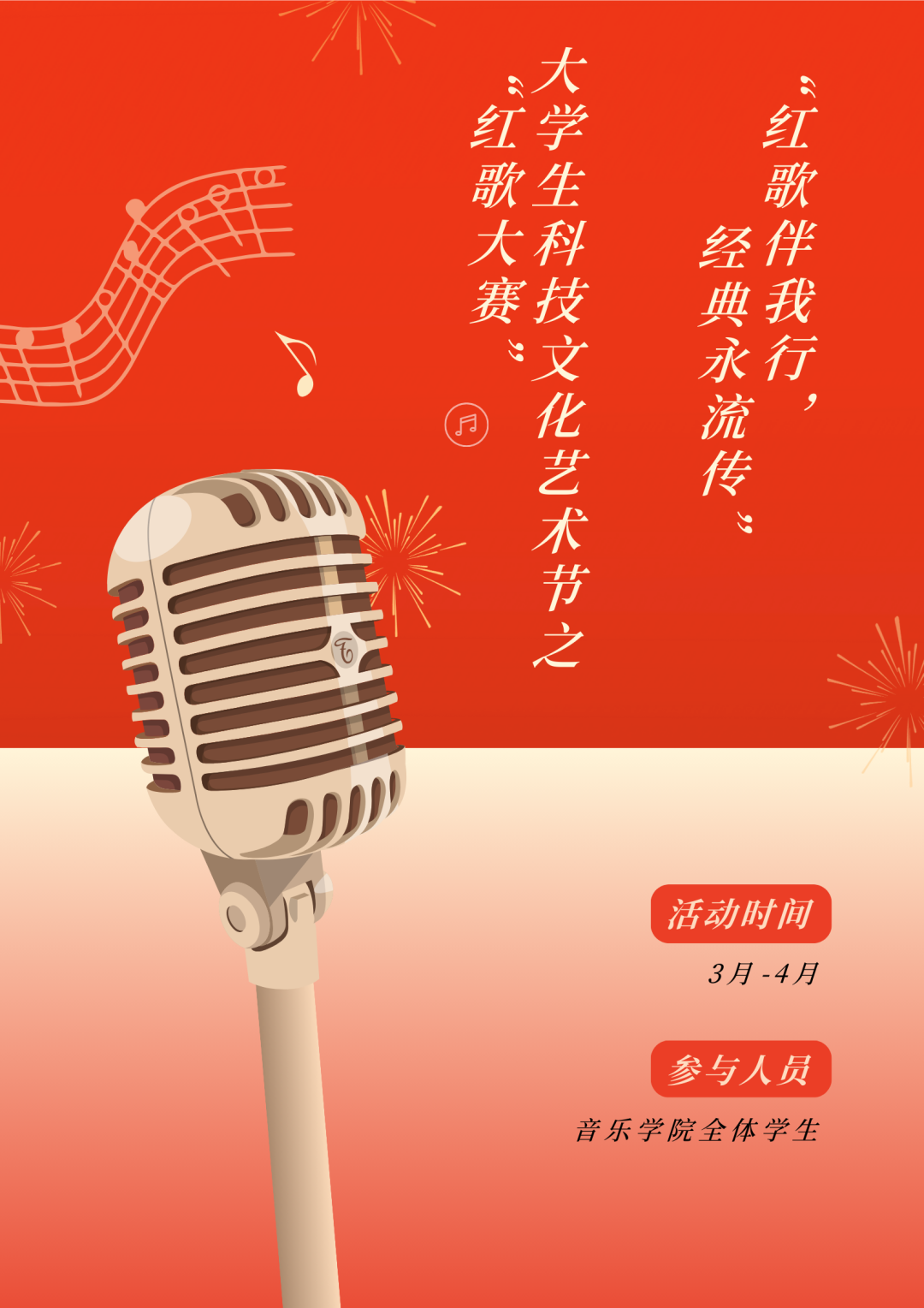 通过此次活动来充分发挥音乐学院专业特色,组织学生进行“红歌伴我行,经典永流传”唱红歌活动通过唱红歌,传承传统文化,弘扬时代精神,进一步加强大学生素质文化教育。唱红歌,颂祖国,踔厉奋发燃薪火,厚植爱国情怀,传承时代精神。
