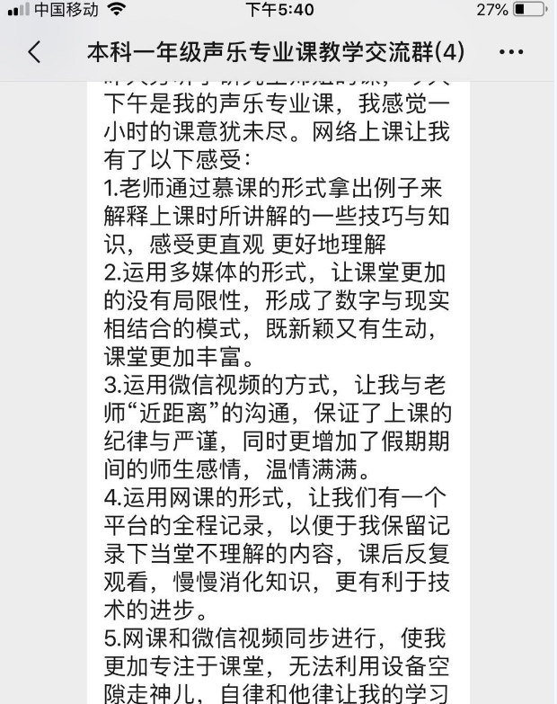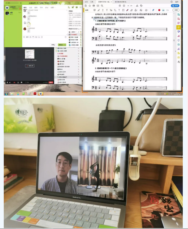 针对视频直播卡顿的问题,管弦系主任邓列加教授、键盘系杨佩胜等教师采用让学生提前上传作品视频,教师开展视频群聊的方式,讲解共性问题,再对学生的个别问题逐一指导。