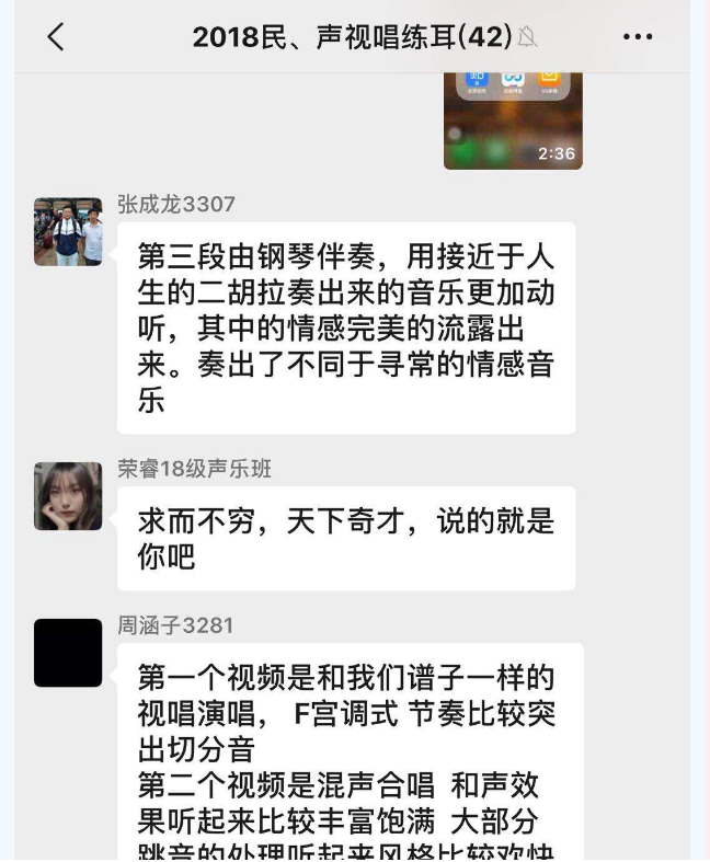 同时建立微信群,学生将自己练习的视频上传其中,大家共同分享练琴经验,讨论练习中的困难与困惑。