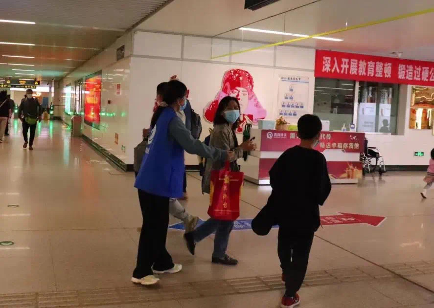 有佩戴口罩的乘客到爱心救助站获取一次性口罩等等。