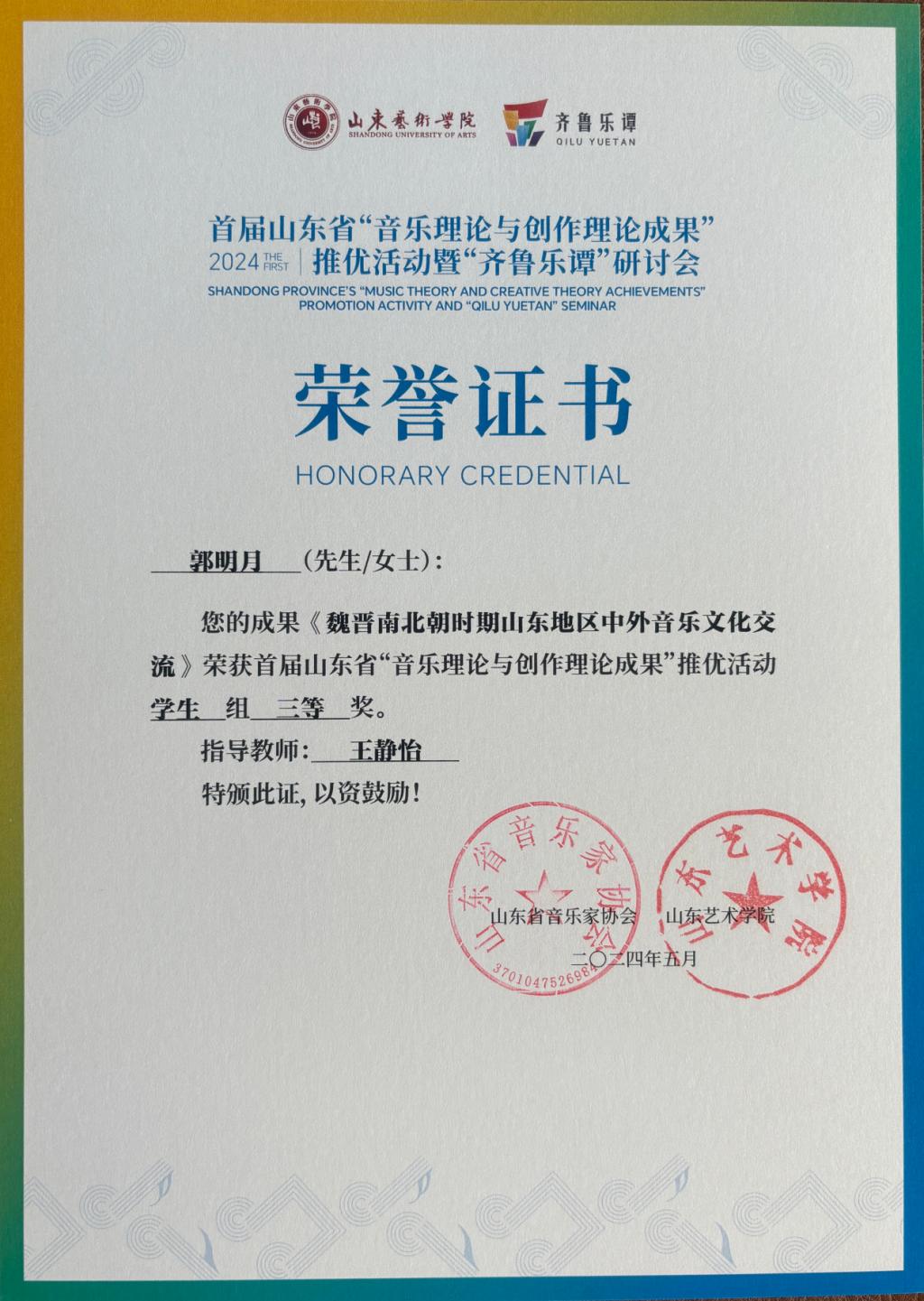 本次活动面向全国征集音乐论文著作及创作成果,组委会共收到了230余件来自国内外学者、作曲家的音乐理论与创作成果,其中学生组评选出2个一等奖、5个二等奖、8个三等奖、15个优秀奖。我院院长王静怡教授指导21级硕士研究生郭明月撰写的文章《魏晋南北朝时期山东地区中外音乐文化交流》发表于《音乐文化研究》(浙江音乐学院学报)第21期,在本次比赛中荣获学生组三等奖!