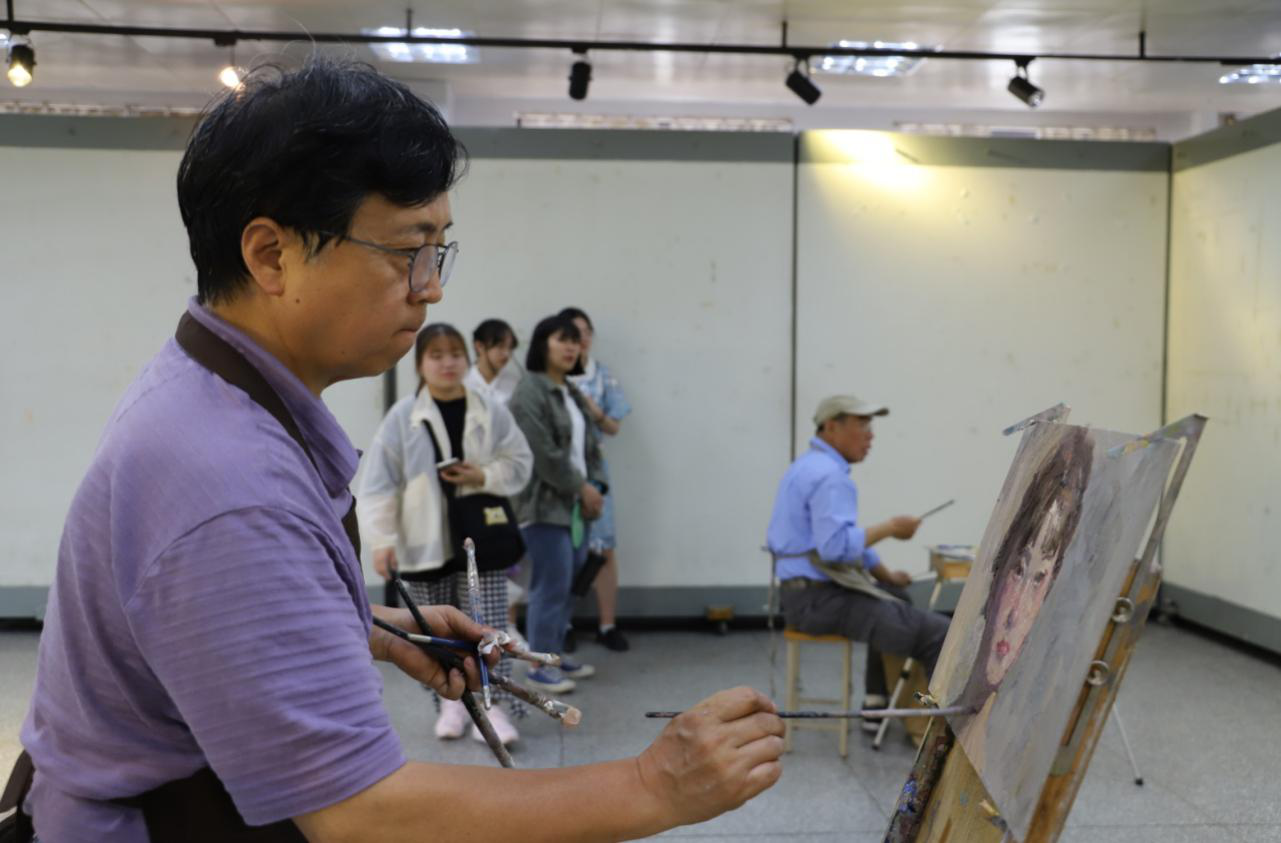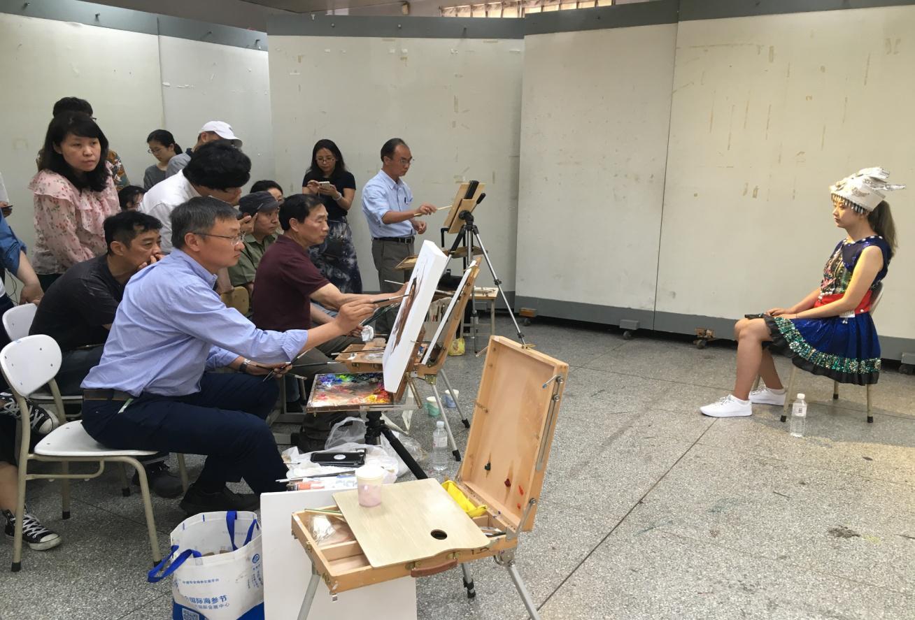 短暂的交流后,艺术家们迅速找位置、调整光线,同时帮助身穿民族服饰的学生模特摆好姿势,然后打开随身携带的画箱进入绘画状态。