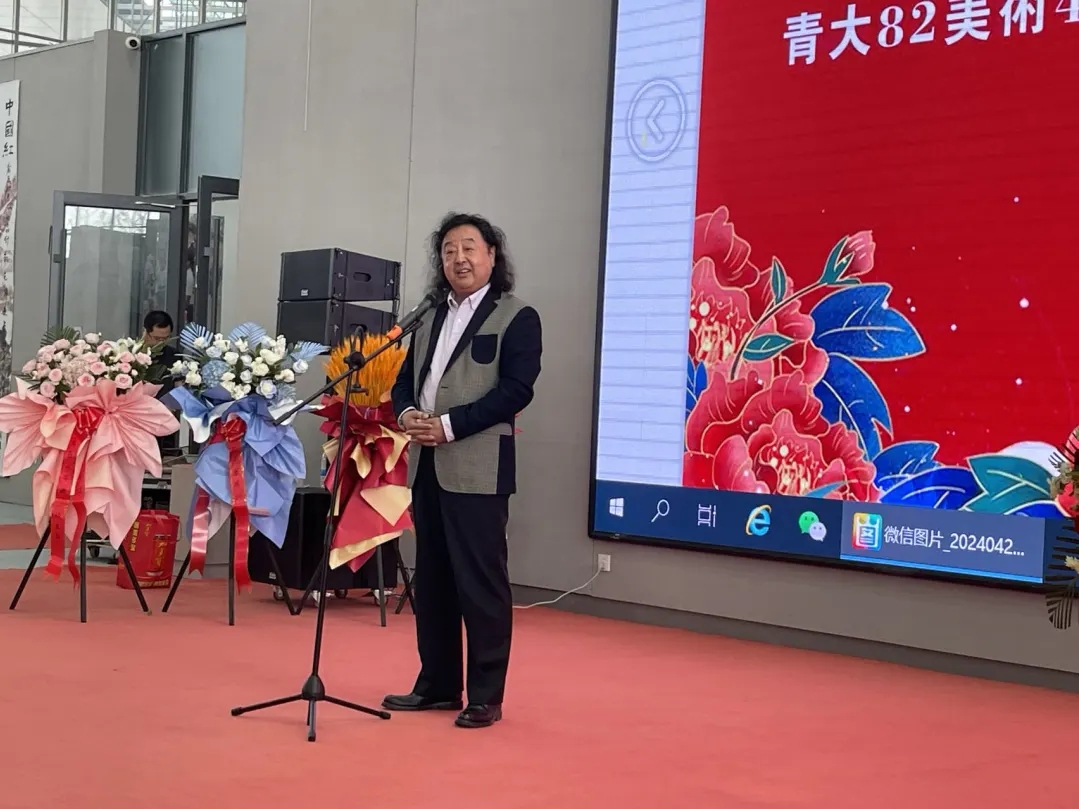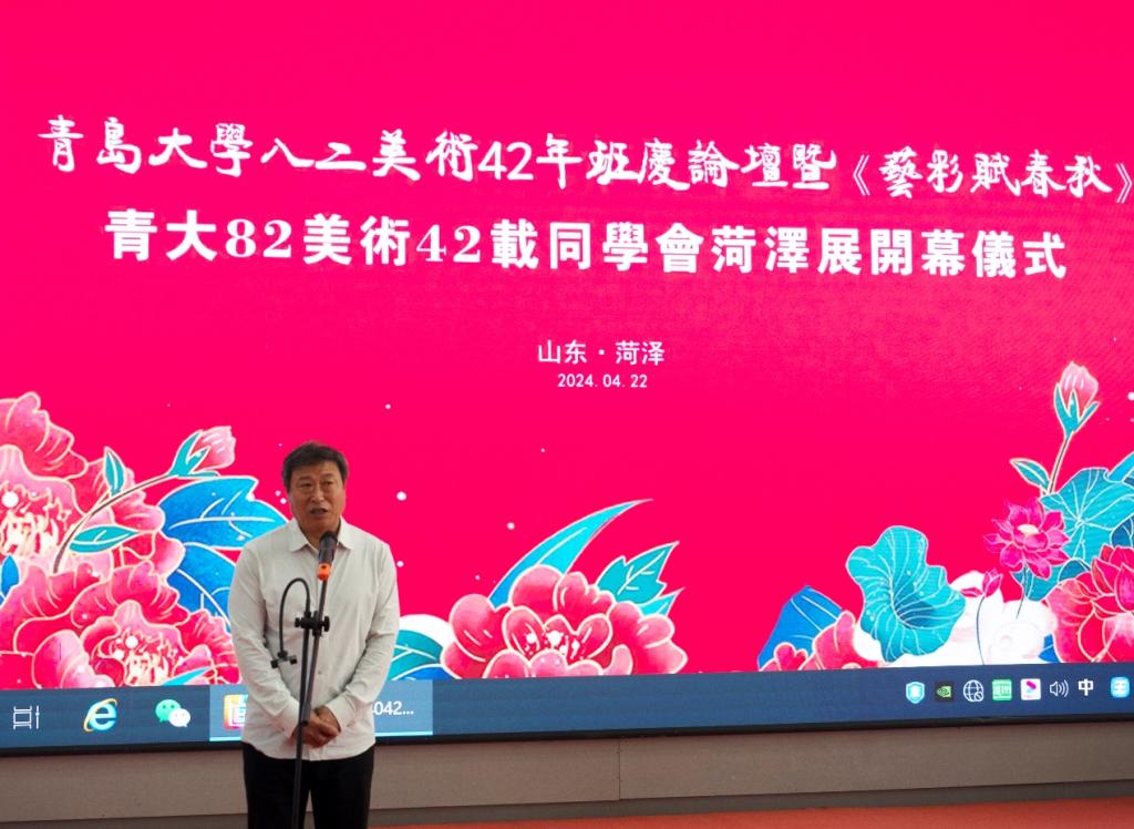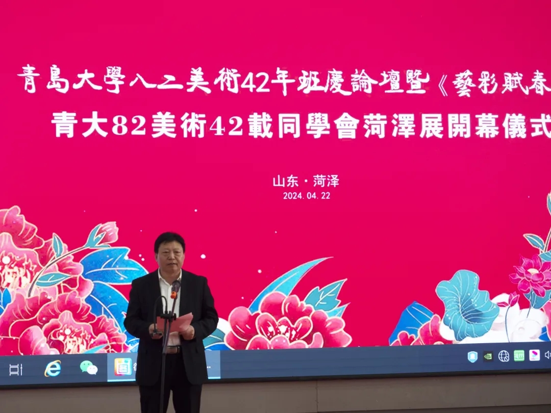 美术学院82级美术班42周年班庆论坛暨《艺彩赋春秋》画展在菏泽开幕。菏泽市文联主席田红雷、菏泽市教育和体育局副局长邓文举,山东省美术家协会第五、六届副主席上官超英,青岛市文联主席、爱情岛