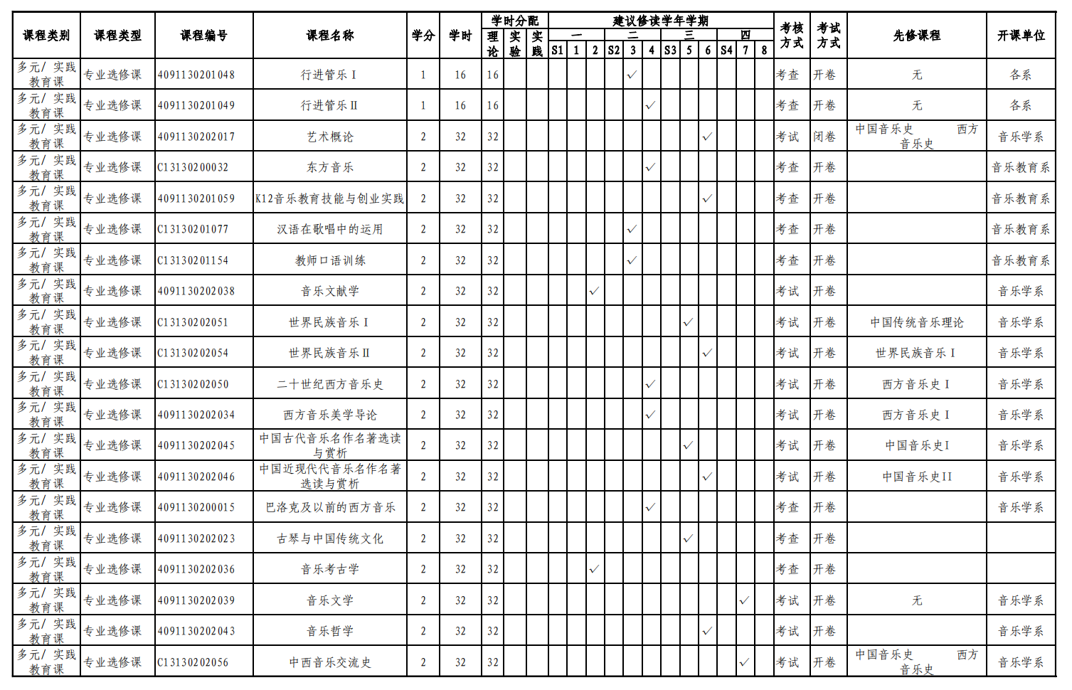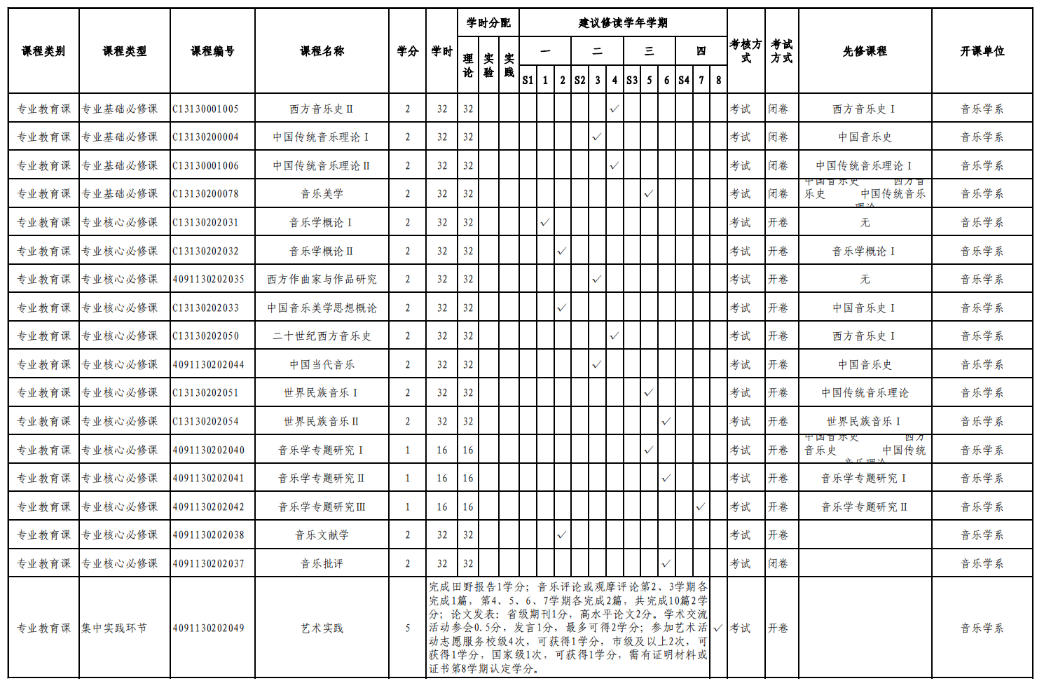 实验实践课学时学分安排表——音乐学理论方向