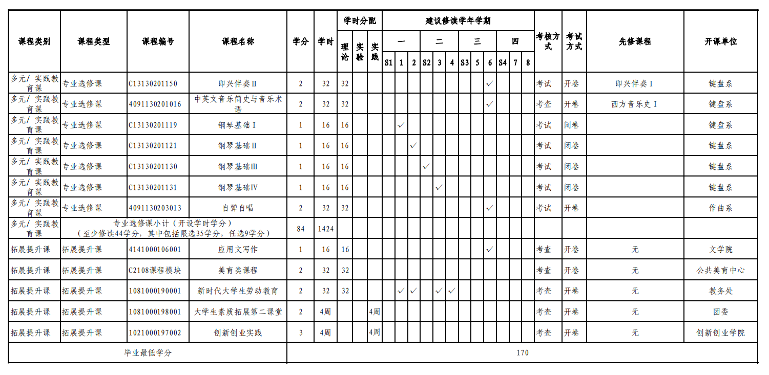 实验实践课学时学分安排表——音乐教育键盘、声乐方向