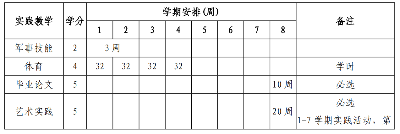 (2)音乐学理论专业修满相关实践学分 5 分。(完成田野报告 1 学分;音乐评论或观摩评论第 2、3 学期各完成 1 篇,第 4、5、6、7 学期各完成 2 篇,共完成 10 篇 2 学分;论文发表:省级期刊 1 分,高水平论文 2 分。学术交流活动参会 0.5 分,发言 1 分,最多可得 2 学分;参加艺术活动志愿服务校级 4 次,可获得 1 学分,市级及以上 2 次,可获得 1 学分,国家级 1 次,可获得 1 学分,需有证明材料或证书。第 8 学期认定学分。)音乐教育专业修满相关实践学分 2 分。(艺术指导满 16 个学时并在期末考试中参加艺术指导,可得 1 分。)专业比赛获奖:校市级 0.5 分,省级 1 分,国家级 3 分。专业演出:院校市级 0.5 分,省级 1 分,国家级 3 分。论文发表:省级期刊 1分,高水平论文 2 分。)