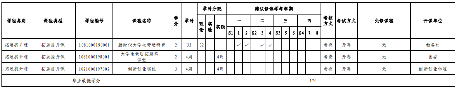3.拓展提升课程主要是根据有关政策要求开设的必修课程或必设项目,为免费修读学分,毕业前至少修读 10 学分。